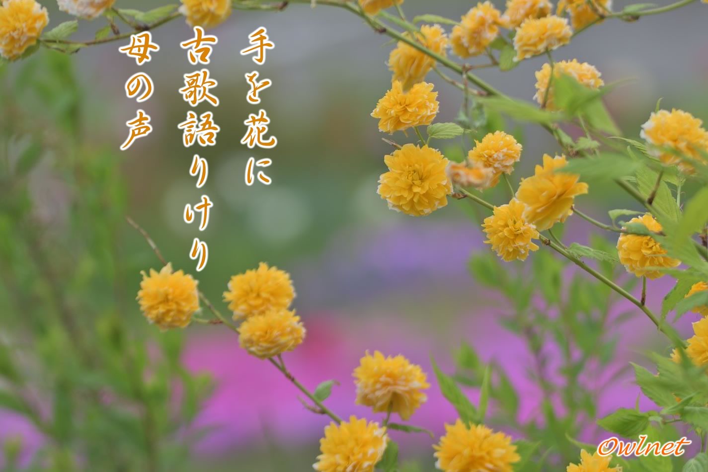 庭の山吹を見て、母が小学生の私に教えてくれた太田道灌にまつわる古歌、「七重八重...」の思い出として作りました。
