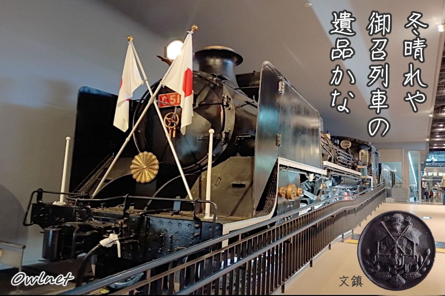 蒸気機関士だった義父は1947年に42歳の若さで亡くなっている。昨年、帰省した時に頂いた遺品の文鎮を手に取って見ると、表はC51の御召列車が彫られ、裏には「準備は萬全 事に當っては平然」と記されていた。これはどうやら旧国鉄の記念品のようだ。こんなきっかけで、大宮の鉄道博物館を訪ねたが、ここに文鎮と同じ御召列車が展示されていた。更に、SLの機関士が大きな汽笛を鳴らしながら転車台を廻る姿に義父を重ね、思いを馳せるひとときとなった。