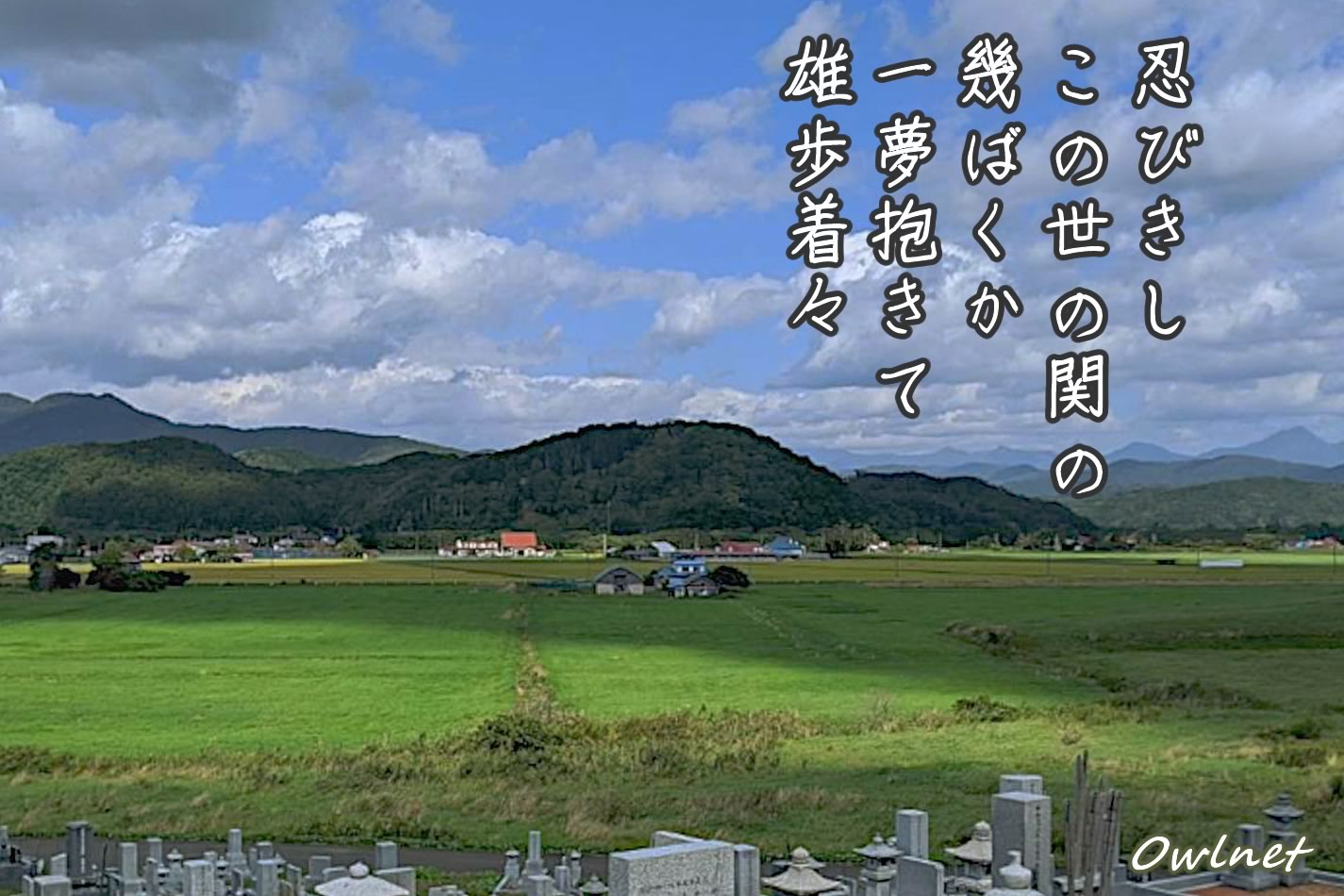 この墓から臨む故郷の景色は草原の中に赤い屋根の実家が見え、更に遙か彼方には日高山脈もある美しい眺めである。話は遡り、私がまだ若かった頃、職員が集まっている談話室に一風変わった流浪の歌人が来ていた。彼は私達の名前を聞くと、すぐにその文字を入れた歌を詠み色紙に書くプロだった。それが珍しくて、私も父のをお願いすると、正しく名前4文字の入った短歌を書いてくれた。この色紙が、たいそう気に入った父は玄関の真正面に飾り、お客が来るたび手に取って自慢していた。さて、この短歌から父の名前が分かるだろうか?