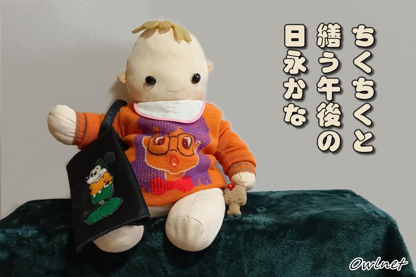 今回は我が家に残っている数少ない思い出の物を取り上げてみた。先ずこのぬいぐるみは三女が結婚の時、私にプレゼントしてくれた。それも娘の誕生時と同じ重さで。次に橙色のセーターは私が二十歳の時に着ていたが、編み直して当時の人気キャラ アラレちゃんを刺繍し長女のセーターに。更にミッキーは次女の体操着袋のアップリケだったが、私のバッグにつけてみた。最後にマスコットの小さな猫は、確か3個作っている筈だけど…。ともかく、こんな手作業が大好きで、今日も私は靴下カバーの踵を繕っている。