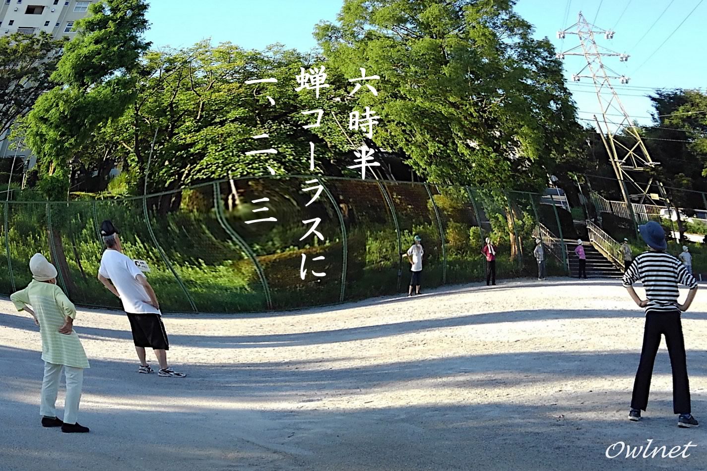 6年前に2名から始まったラジオ体操。リーダーの都合で8月から土、日、祭日が休みとなった。通い始めて1か月、体操が1日のリズムになっている。「ラジオを持って来ますから、休日も体操をしませんか?」と、数人に声をかけた。初日の土曜日は半分の9名が集まり、ラジオも3台揃った。賑やかな蝉の声とともに、新しい朝が来た。