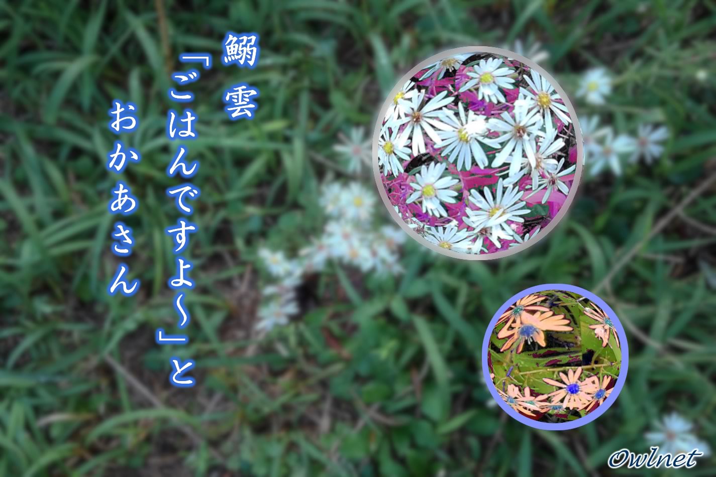 (アッ、ごはん) この花を見て、幼い頃のままごとを思い出した。白い野菊はご飯です。外で遊んでいるわたしたちを、お母さん役の良子ちゃんが呼びます。庭にむしろを敷いて、お昼ご飯は割れた茶碗にダリアやコスモスのおかずが盛ってあります。みんな揃って「いただきま~す」、箸は木の枝でした。