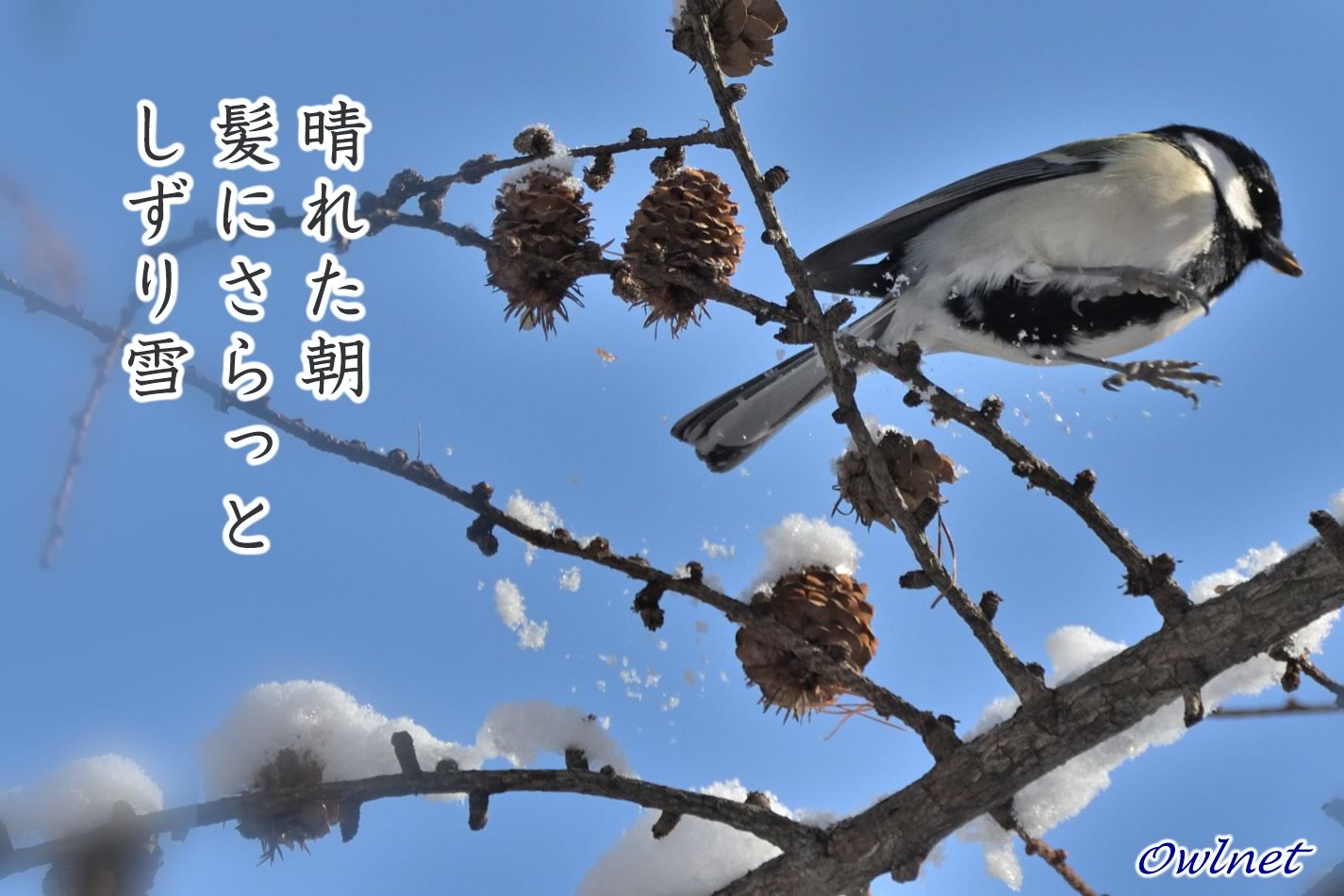 しずり雪とは、木の枝などに降り積もった雪が滑り落ちる事である。このシジュウカラは胸から腹にかけて太く黒いネクタイ模様なのでオスである。こんな光景を見ると、生活の糧を求めて出勤するネクタイ姿のサラリーマンとダブって見えた。
