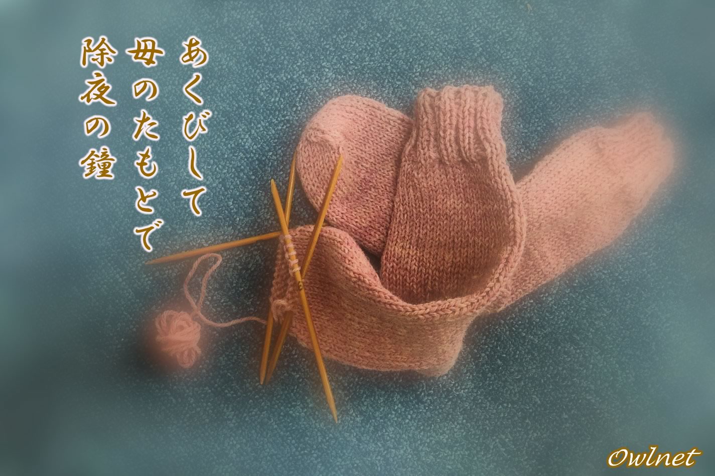 1955年(S30年)の頃です。お正月用のセーターとコールテンのズボン、メリヤスの肌着は畳んで枕元に置きました。あとは靴下だけです。わたしはせっせと編んでいる母の手元を見つめます。「早く寝なさい」、そう言われても寝られません。明日の登校までに出来上がるのか心配です。ぬかストーブの火は赤く、鉄瓶から白い湯気が立っています。あと少しで除夜の鐘です。