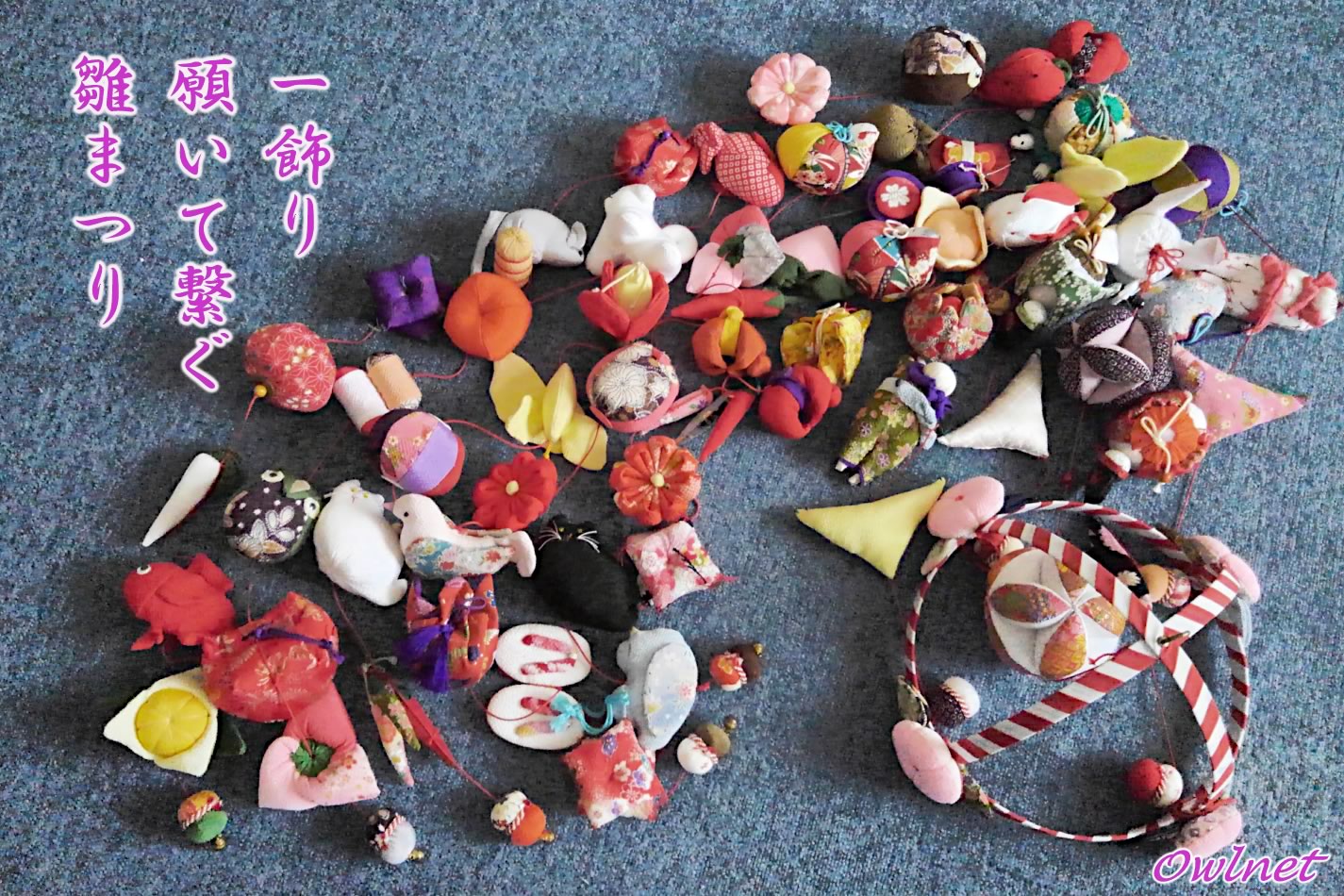 「雛人形をしまうのが遅いと晩婚になる」と言うのは迷信と知りつつ、雛まつりの翌日には片付けていた。その甲斐あってか、娘達は良き伴侶に恵まれ一安心した。ところがその後、子育て中の日々を思い出し、余りにも反省する事が多く心がざわついていた。しかし、今の私に出来る事は限られている。そこで一つ一つに意味のある吊るし雛を贈ろうと思った。幸せを願う77個の雛づくりは無心になれる時間だった。これはもう15年も前の事である。