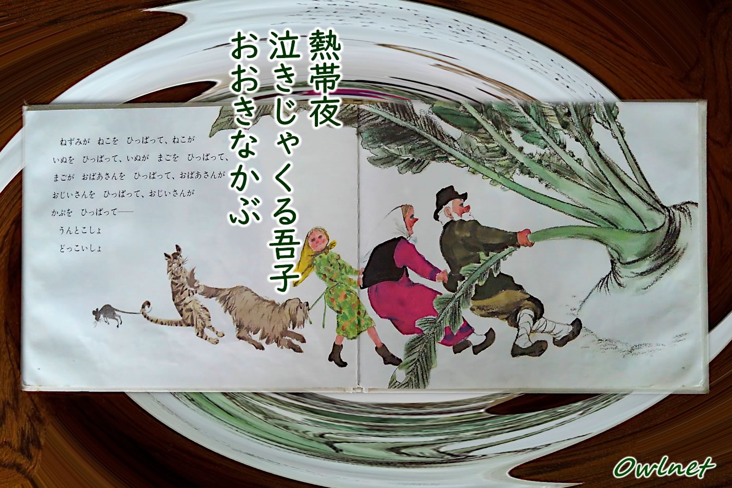 「ダダダーッ!」真夜中の暴走バイクに、1歳の娘は悲鳴をあげ火がついたように泣いた。どんなにあやしても興奮は治まらない。困り果てたわたしは、気分を変えようとリビングの灯りを点けた。更に本箱から絵本を出し娘を膝抱っこして読んでみた。すると、安心したようにすやすや眠ったのだ。そんな事が毎晩続いて、小さいのに絵本がわかるんだと気がついた。それからは毎日、他の絵本も読んでやるとたちまち大好きになった。そして、この「おおきなかぶ」は、半年で100回以上も読まされた。