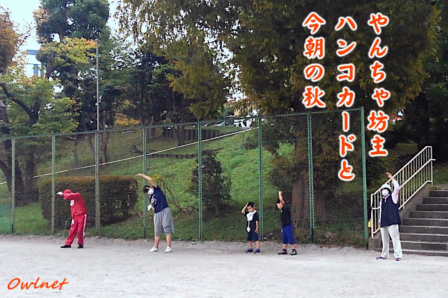 私達は、メタセコイア(曙杉)に囲まれた広場でラジオ体操をしている。そこに8月から小1と幼稚園の兄弟が仲間入りした。当初、夏休みだけだと思っていたが、10月の今も、6時半にバタバタッと走ってくる。そして2人がする上下左右のバラバラ体操がなんとも可愛らしい。最後に、リーダーからハンコを貰い意気揚々と帰る姿に、みんなでエールを送っている。