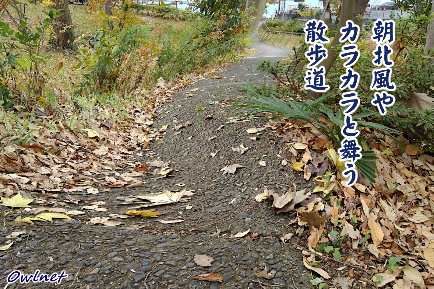 ウオーキングで通るこの道は、野鳥のさえずりが聞こえる心地良い場所である。今、鳴いているのは何かしら? ここでは、ムクドリ・シジュウカラ・スズメの他にどんな鳥がいるのだろう。最近、これらの野鳥が減っていると聞いた。どうやら環境の変化で餌となる昆虫の減少が影響しているらしい。そんな事を思っていると、急に強い風が吹いて、目の前の枯葉が次々と坂道を転がって行った。それは子供たちが、かけっこをしている姿によく似ていた。 ※ 朝北風:あさぎた