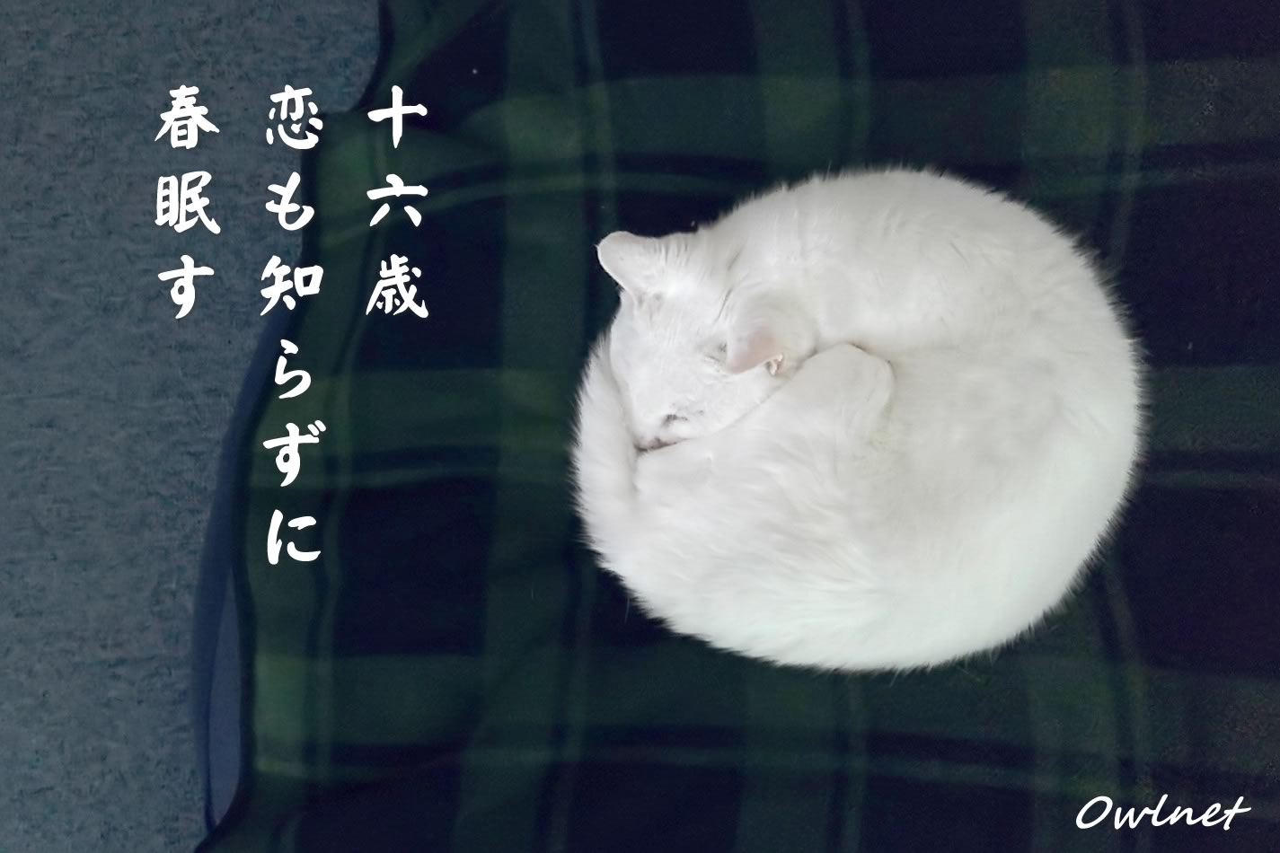 春の季語に「猫の恋」を見つけた時、傍らでアンモナイトみたいな格好で眠るチコの事を思った。16歳と言えば青春真っ只中のイメージだが、猫の16歳は人間で言う80歳だ。若い頃のチコは時々家から脱走したが、足がすくんで動けず外でブルブル震えていた。こんなことでは恋どころか冒険さえも出来ず、遂に脱走は諦めたようだ。今では、私からせしめたビーズクッションの上で、ほぼ1日中うたた寝をしているが、快食快便とマイペースな性格もあり、健康そのものである。