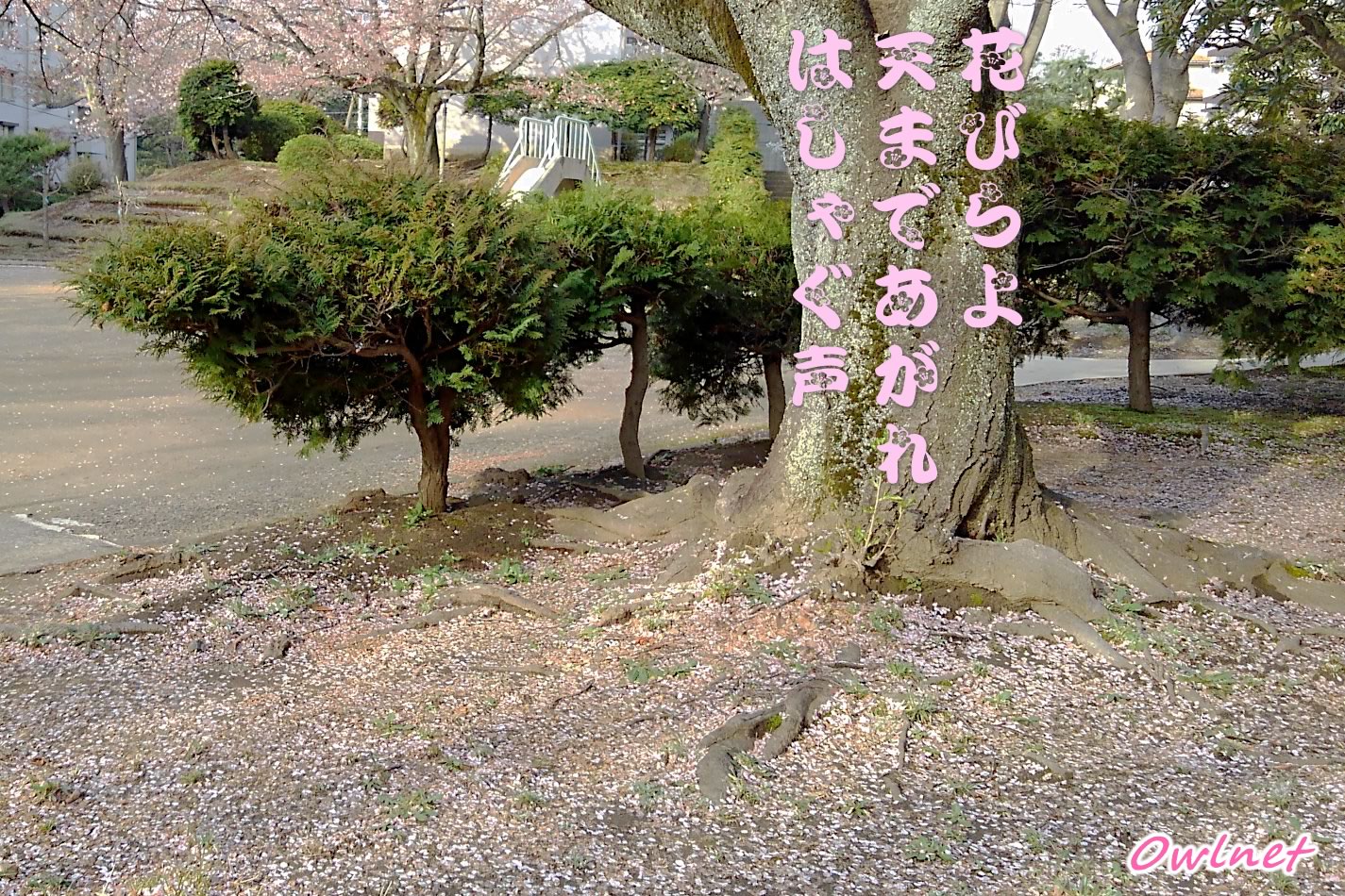 今年の桜は例年にも増して美しかった。先日、花びらを手一杯に集め、飛ばして遊んでいる園児達を、近くの公園で見かけた。そのとき写真を撮っていた保育士に、「後ろ姿だけ撮るのもいけませんか?」と聞いてみたが、案の定断られた。しかし、「この姿をしっかり目に焼きつけて下さい」との言葉が印象に残った。そう言えば、横浜生活のスタートはこの公園前の家だった。ベランダから公園が見えたので、娘達が近所の子供達と遊んでいた姿は、今も私の目に焼きついている。