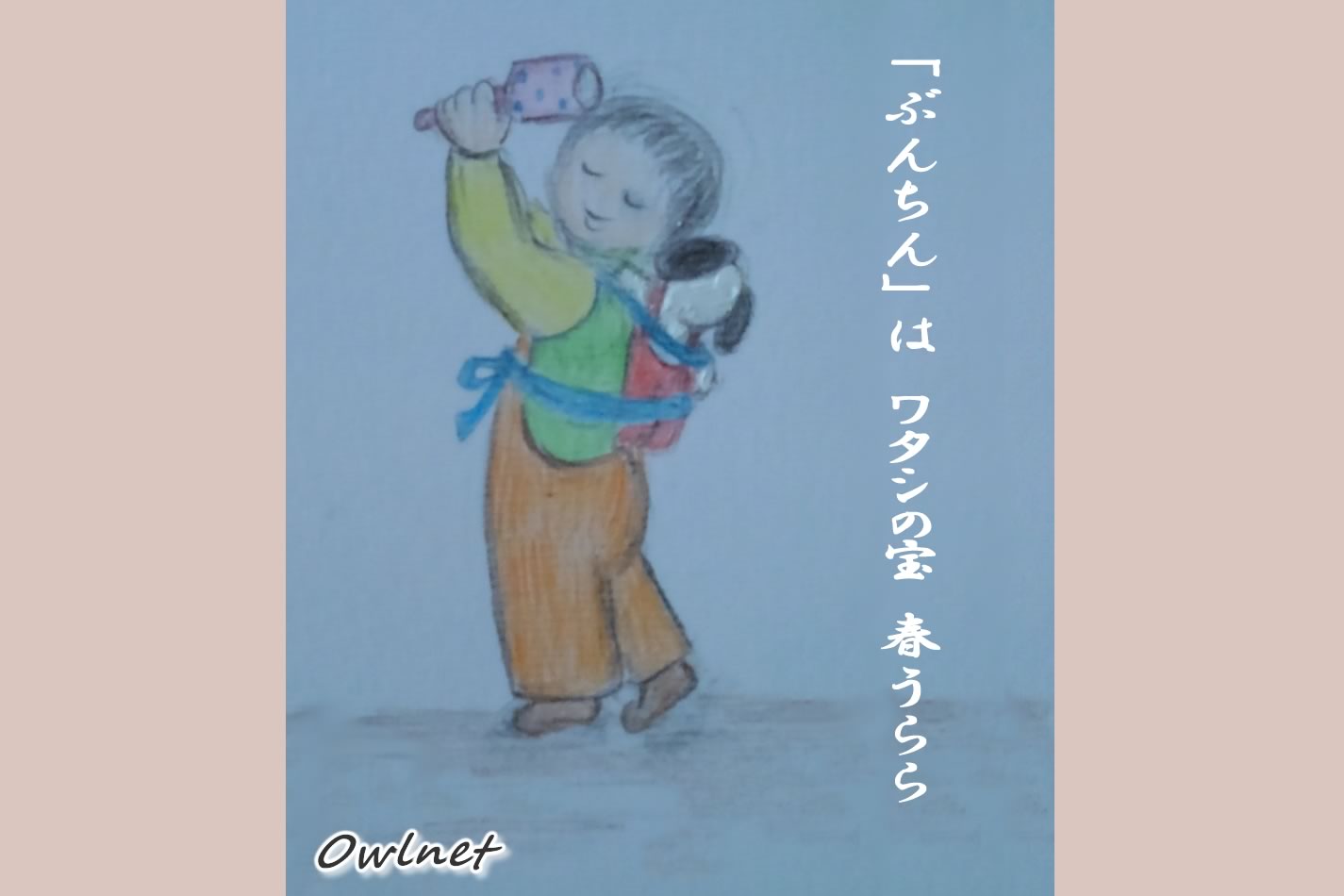 頬被り姿? このご時世、マスク姿にも見えます。今、子どもたちは、外で思いっきり遊ぶことができません。あと少しです。「本当の春」は必ずやって来ます。その日まで、首をなが~くして待ちましょうね。