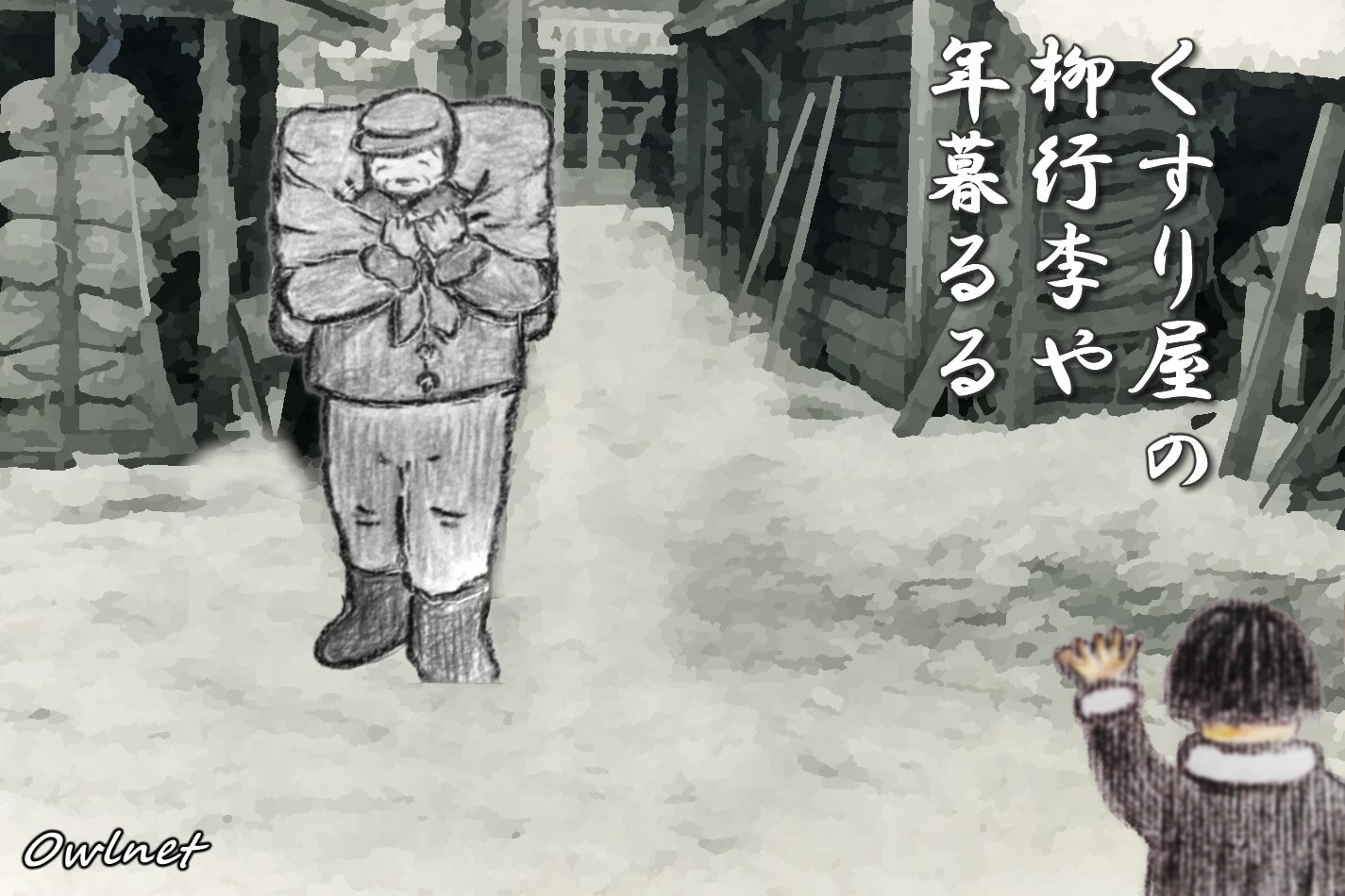 今年も富山の売薬さんがやって来た。村の親戚を拠点に、お客さんの所を数日かけて回るのだ。売薬さんは茶の間に荷物を下ろすと、紙風船を1つ膨らませて、ポ~ンと私に放ってくれた。こうして、おまけの紙風船を数枚貰うのが年末の楽しみだった。売薬さんは世間話をしながら置き薬の精算と補充をし、仕事が終ると何段もの柳行李を背に雪道を帰って行った。あの薬箱の苦い正露丸は、お腹が痛くなった時の魔法の薬だった。